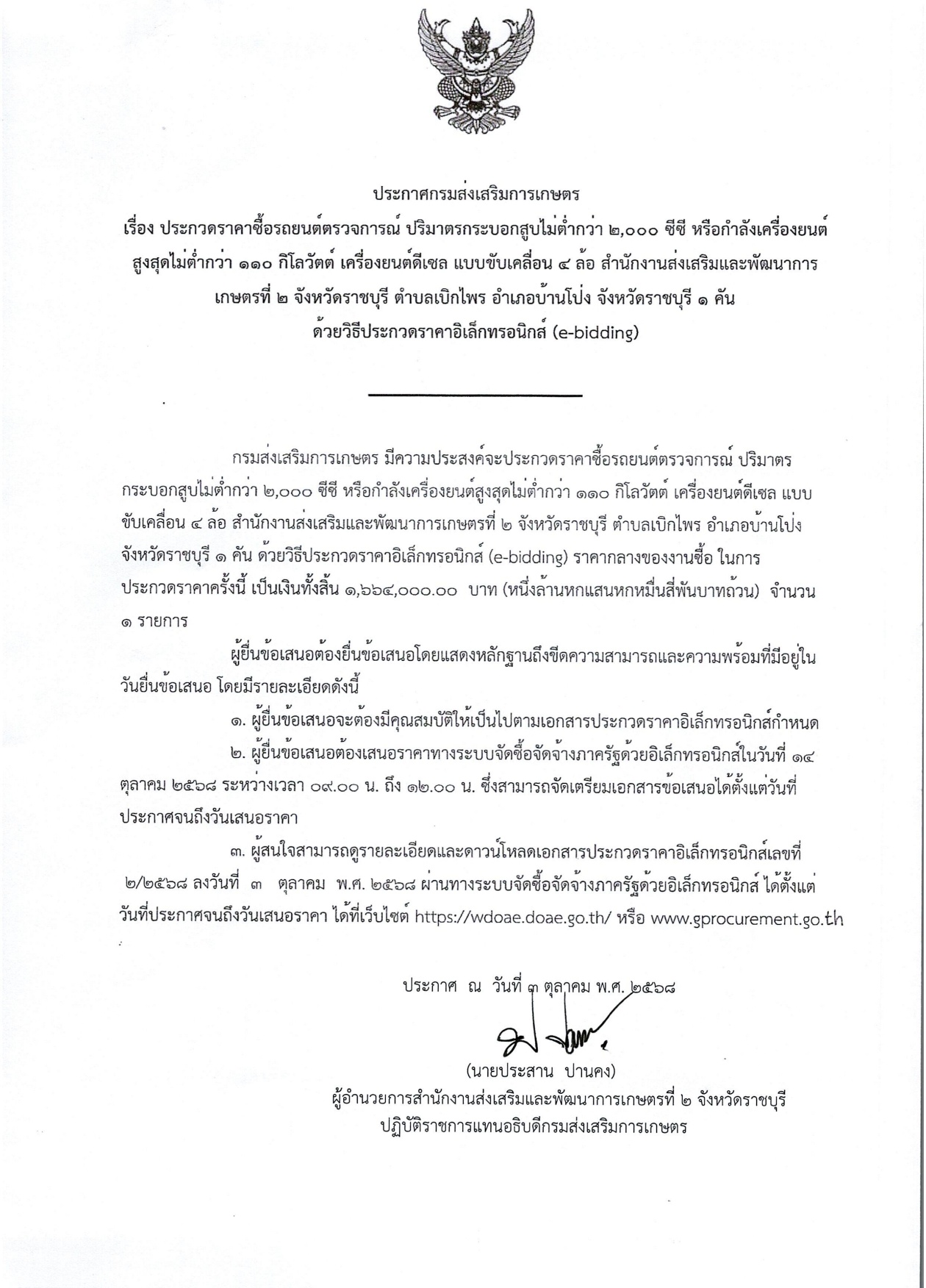 ประกาศกรมส่งเสริมการเกษตร เรื่อง ประกวดราคาซื้อรถยนต์ตรวจการณ์ ปริมาตรกระบอกสูบไม่ต่ำกว่า 2,000 ซีซี หรือกำลังเครื่องยนต์สูงสุดไม่ต่ำกว่า 110 กิโลวัตต์ เครื่องยนต์ดีเซล แบบขับเคลื่อน 4 ล้อ สำนักงานส่งเสริมและพัฒนาการเกษตรที่ 2 จังหวัดราชบุรี ตำบลเบิกไพร อำเภอบ้านโป่ง จังหวัดราชบุรี 1 คัน ด้วยวิธีประกวดราคาอิเล็กทรอนิกส์ (e-bidding)