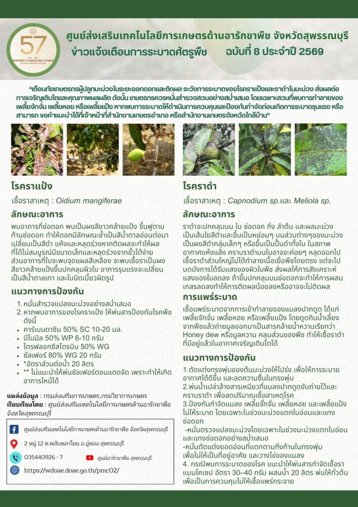 Homeข่าวแจ้งเตือนการระบาดศัตรูพืช ฉบับที่ 8 ประจำปี 2569 เรื่อง โรคราแป้ง และราดำ ข่าวแจ้งเตือนการระบาดศัตรูพืช ฉบับที่ 8 ประจำปี 2569 เรื่อง โรคราแป้ง และราดำBy admin_doae / 28 มกราคม 2026 Post Views: 122