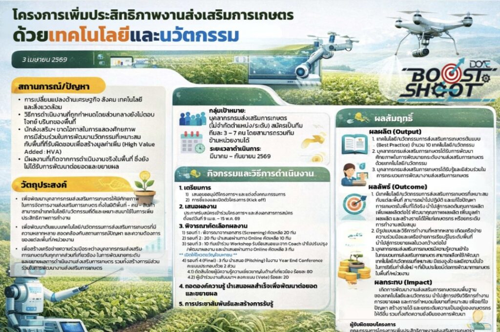 HomeDOAE BOOST & SHOOT ปลุกพลังคนกรมส่งเสริมการเกษตร โชว์ต้นแบบการทำงานที่สร้างสรรค์ สู่ Best Practice ชิงรางวัลรวมกว่า 180,000 บาท DOAE BOOST & SHOOT ปลุกพลังคนกรมส่งเสริมการเกษตร โชว์ต้นแบบการทำงานที่สร้างสรรค์ สู่ Best Practice ชิงรางวัลรวมกว่า 180,000 บาทBy admin_doae / 7 เมษายน 2026 สรุปภาพรวมโครงการฯ ชี้แจงโครงการฯ PPT นำเสนอชี้แจง DOAE Boost _ Shootดาวน์โหลด คู่มือโครงการฯ คู่มือโครงการเพิ่มประสิทธิภาพฯ 030469ดาวน์โหลด Timeline โครงการฯ Timeline โครงการเพิ่มประสิทธิภาพงานส่งเสริมฯดาวน์โหลด แบบเสนอผลงานฯ (ใบสมัคร) แบบเสนอผลงานฯ (ใบสมัคร)ดาวน์โหลด Post Views: 181